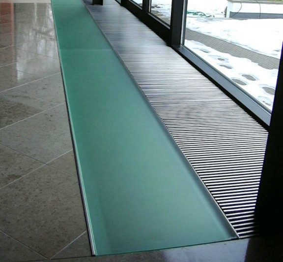 - Стеклянный модуль встроен в пол из дерева. Цельный стеклянный лист из 18 мм триплекса. Обычное стекло, под стеклом декоративная композиция.