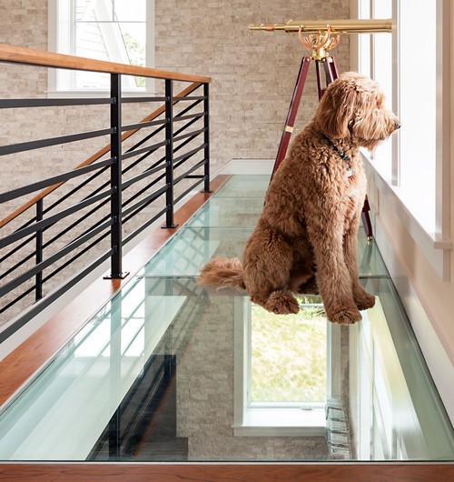 Интересное дизайнерское решение. Пол из ультрапрозрачного стекла в коридоре на спальном этаже дома.