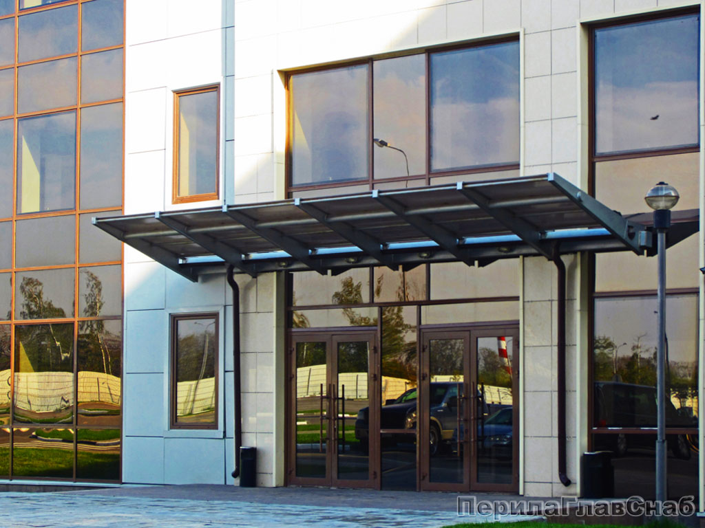 Нельзя не отметить универсальность данного оформления экстерьера. Разнообразие вариантов кронштейнов позволяет органично вписать козырек в любой дизайн-проект здания. Выбрать оптимальную модель козырька вы можете в нашем каталоге или заказать консольные стеклянные козырьки по собственному эскизу.