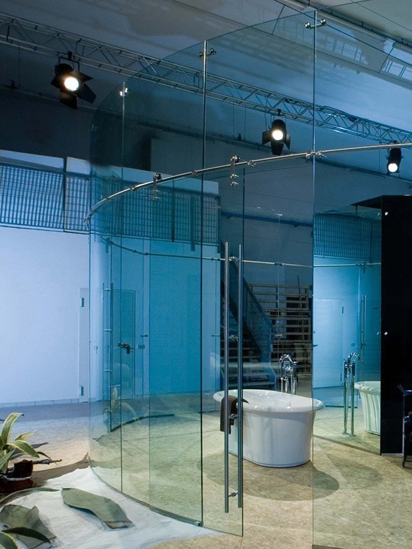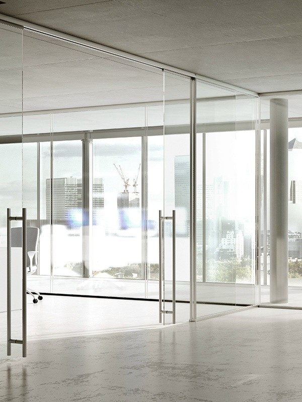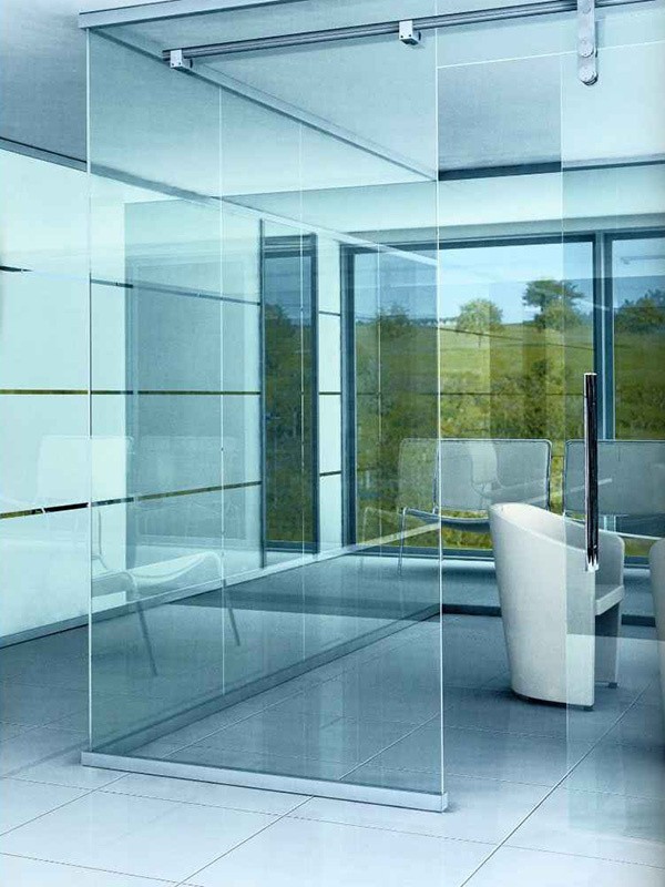- Цельностеклянные перегородки — безрамочные конструкции, создающие эффект прозрачных стен и максимальной открытости.